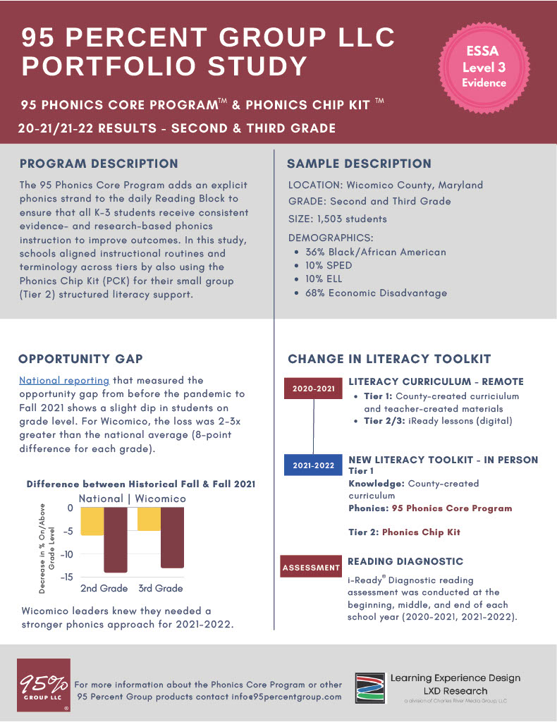95 Phonics Core Program provided Wicomico educators with an explicit phonics program to add into their daily reading block. It ensured that all K-3 students received consistent evidence–based phonics instruction to improve outcomes. The district’s schools also aligned instructional methods and learning routines across tiers by also using the 95 Phonics Chip Kit for their Tier 2 structured literacy support.