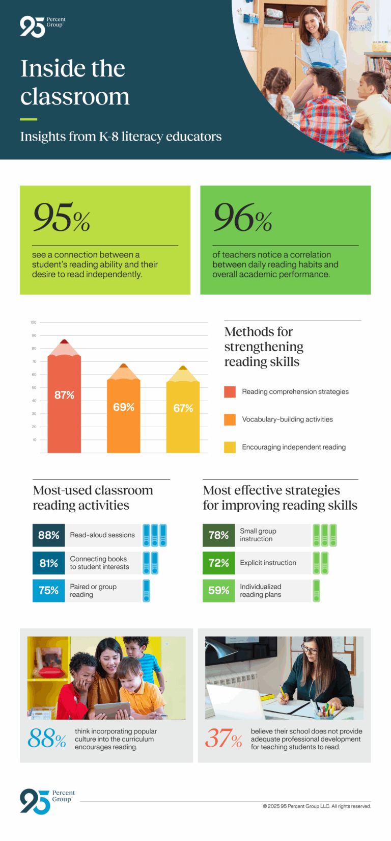 Indeed, students developing foundational reading skills and extracurricular reading habits are key signifiers for overall success. When we asked 211 K-8 literacy educators about student reading habits, nearly all of them agreed: 96% noticed a correlation between daily reading habits and overall academic performance. Additionally, 95% connect strong reading skills to a desire to read independently.