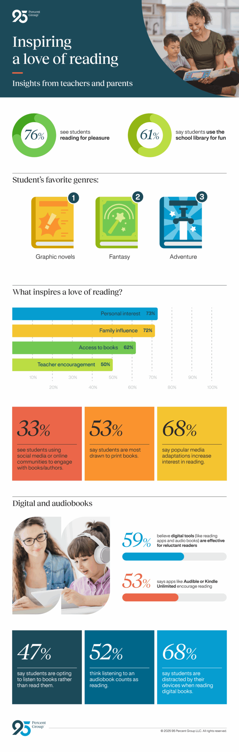 While most still prefer print books, many are turning to audiobooks or reading them digitally (such as on iPads and Kindles). These formats may be helpful for young readers on the go. Over half (59%) of parents and teachers believe these digital tools are effective for reluctant readers, and 63% say apps like Audible or Kindle Unlimited are encouraging them. However, 68% say that students are distracted by their devices when reading digitally, which could potentially impact comprehension.