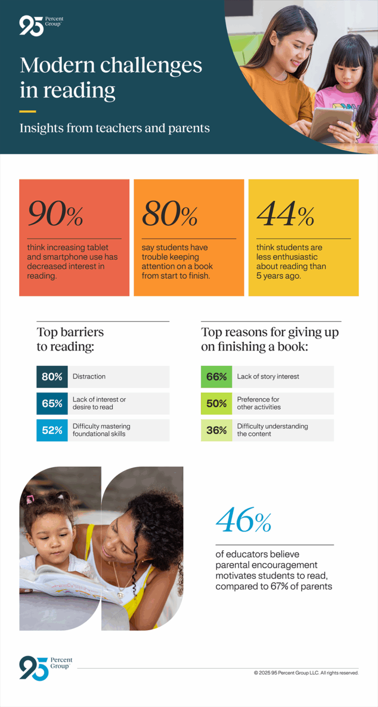 Our survey also revealed a disconnect between teacher and parent perspectives. While 67% of parents believe their encouragement motivates students to read, only 46% of educators agree. Although parents see themselves as powerful influences on reading habits, they may find greater success by supporting their children’s interests more broadly and ensuring they have regular access to a library and books at home.