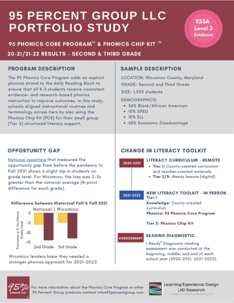 95 Phonics Core Program provided Wicomico educators with an explicit phonics program to add into their daily reading block. It ensured that all K-3 students received consistent evidence–based phonics instruction to improve outcomes. The district’s schools also aligned instructional methods and learning routines across tiers by also using the 95 Phonics Chip Kit for their Tier 2 structured literacy support.