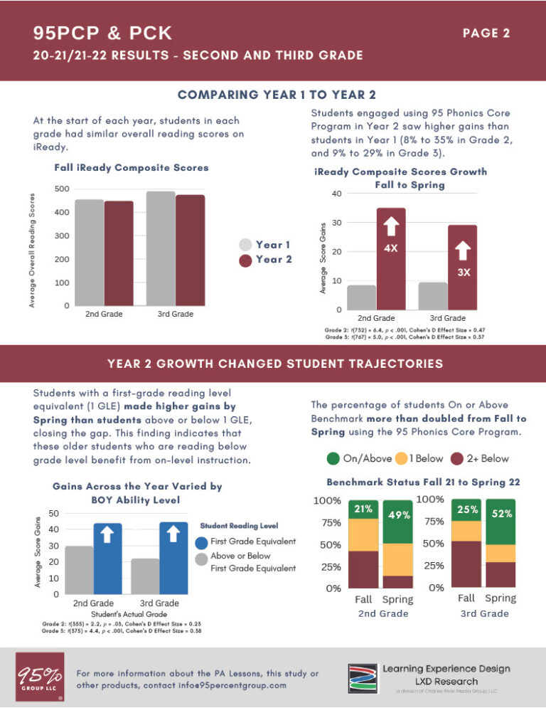 Students using 95 Phonics Core Program in year 2 saw higher gains than students in year 1 (8% to 35% in Grade 2, and 9% to 29% in Grade 3). In year two, the percentage of students on or above benchmark more than doubled from fall to spring using the 95 Phonics Core Program. Read more below.