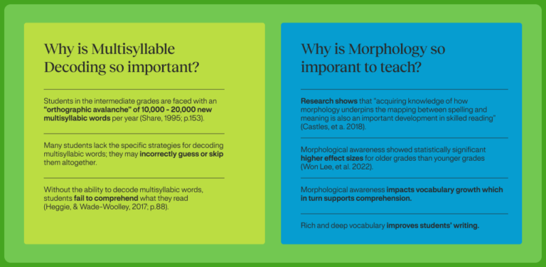 A common misconception that persists is that 4th and 5th graders don’t need explicit phonics instruction. However, recent national statistics indicate upper elementary students are showing minimal improvement in literacy, negatively impacting their comprehension skills. The Institute of Education Sciences’ What Works Clearinghouse and expert panel summarized 32 studies regarding reading interventions for grades 4-9 and recommend, with strong evidence, to “build students’ decodable skills so they can read complex multisyllabic words” (Vaughn et al., 2022) to advance their overall literacy skills.