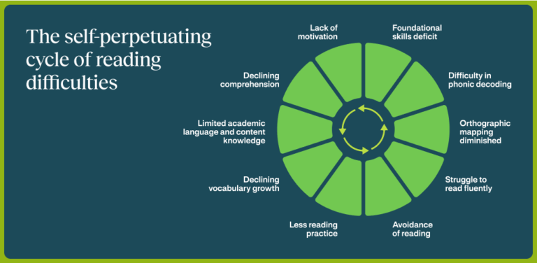 Laura Stewart, Chief Academic Officer for 95 Percent Group, calls this the “self perpetuating cycle of reading difficulties.” When students have foundational skill gaps and can’t access grade level text, they begin to feel inadequate, or like something is wrong with them. This feeling leads to low self confidence and ultimately disengagement with the work which only leads to students falling further behind.