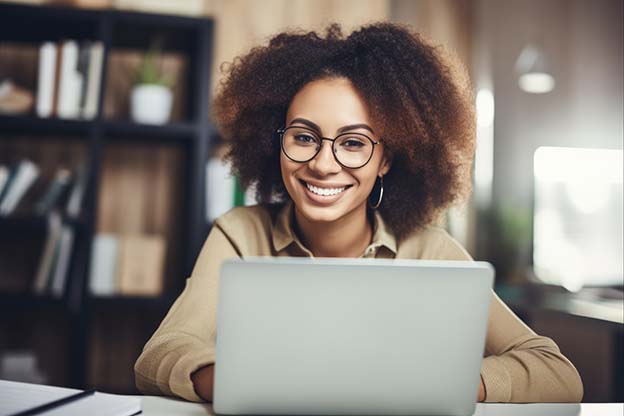 A young woman, deep in thought, enjoying her coffee as she navigates her laptop in a warm and inviting kitchen. The sunlit space creates a tranquil atmosphere.