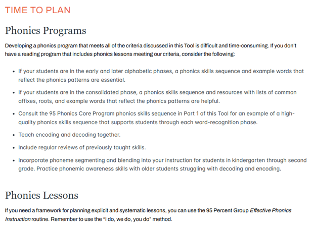 Each of the course’s tools include five segments that support educator knowledge and practice. Sample effective decoding and encoding instruction content from Tool 4: Phonics and Spelling.